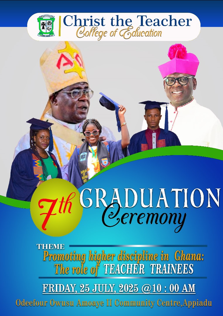 7th Graduation Ceremony This event has expired THEME: Promoting higher discipline in Ghana. The role of Teacher Trainees Start Time 10:00 am July 25, 2025 Finish Time 2:00 pm July 25, 2025 Share:
